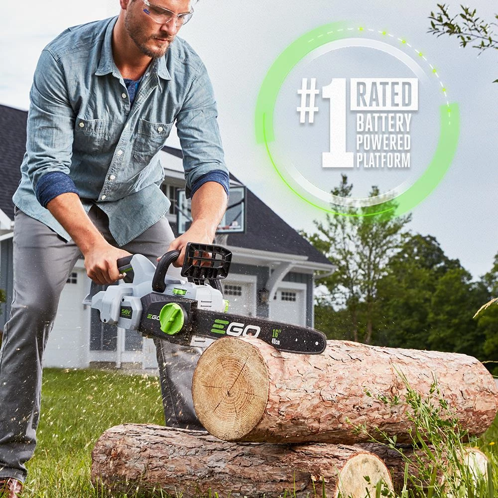 The EGO POWER+ Chain Saw truly delivers Power Beyond Belief. The 16-in bar and chain, combined with a hi-efficiency brushless motor provides effortlessly smooth cuts. The brushless motor extends both the life of the tool and the run time. The advanced 56V ARC Lithium™ battery uses industry-leading technology to deliver Power Beyond Belief and is compatible with all EGO POWER+ products. The EGO POWER+ Chain Saw delivers the performance of gas without the noise, fuss and fumes.